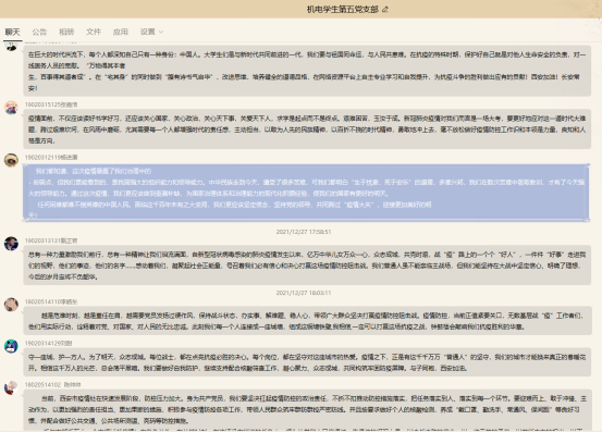 本次“思政大课”特别邀请了西安工业大学马克思主义学院副教授冯婷博士结合当下全国疫情形势,以“与子同袍,西安加油”为主题,将思政课理论与今日之中国抗击疫情的具体实践紧密结合,深入解读当下疫情形成原因及党中央关于疫情防控的决策部署,分析中国抗疫彰显的中国共产党领导和中国特色社会主义制度的显著优势。同时结合校园防疫措施与广大志愿者的事迹,讲述防疫抗疫一线的感人故事。在直播结束后,党支部第一时间组织支部成员通过群聊进行线上集体讨论,共同深入学习中国抗疫彰出的中国特色社会主义制度优势和防疫抗疫一线的感人事迹。支部成员纷纷表示,应不忘入党初衷,在这个特殊时期,把自己的家国情怀与人民的事业紧密相连,用一个奋斗者最美的姿态去冲刺人生的百米赛道,一起在疫情防控中传递中国精神,展现责任担当。